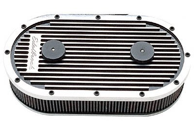 The Edelbrock Elite Series Oval Air Cleaner is designed to fit Edelbrock dual-quad carburetors. These oval air cleaners clear HEI (Heat Energy Ignition) distributors and stock parts. They come with high-quality 2.5 inch washable, pre-oiled cotton gauze filter for excellent filtration. The top material is made of aluminum with a natural finish and the base material is made of steel with a chrome finish. To keep the engine clean, replace the original filter element in the Edelbrock air cleaner with a new element every 3,000 miles.